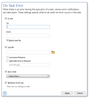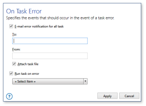 As part of Automate's "tri-level" error handling, errors may be handled on a per task basis. This is ideal if the user wants Automate to perform specific exception handling procedures for a managed task. A task level error occurs when a step within a task fails and Automate generates an error. This causes the task to notify the Task Service of the failure, which allows the task's error level handing events to occur. Task level error handling can be set individually for any task and can be configured in the Task Administrator by accessing a task's Managed Task Properties and selecting On Error. Doing so will open the On Task Error page (as shown below). For further details, see On Error.