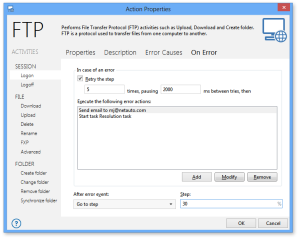 If a step fails, the user can select from a number of actions to be carried out. These actions are located in the On Error tab of any specific step (as shown below).
