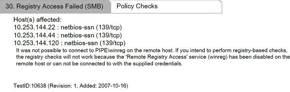 When an authenticated scan runs but doesn't generate the expected results (for example, missing MS bulletin vulnerabilities or third-party application-related vulnerability), it means that the authenticated scan didn't work. Another indicator for the failure may be the next text inside the report: