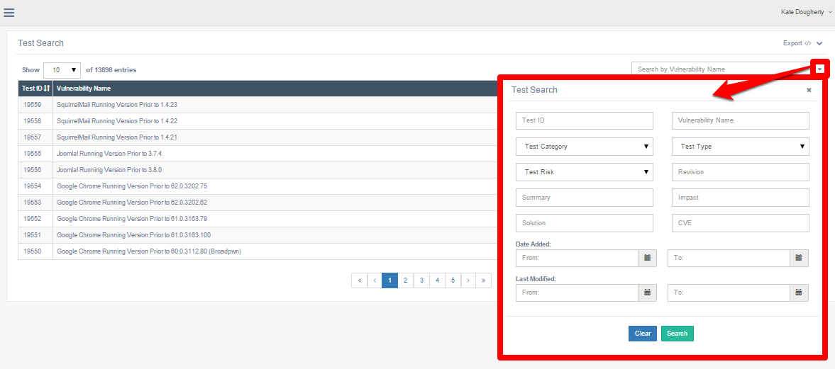 Use the search box to search for a test by Vulnerability Name, or click the arrow in the search box to open the advanced search options. The advanced search allows you to retrieve tests based on the following fields: