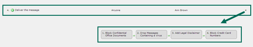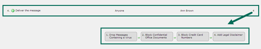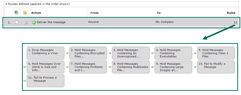 The first rule will scan the email looking for keywords as configured in the rule. However, there is little point in doing this because the second rule will drop the email if a virus is detected. The position of the Add Legal Disclaimer rule also makes this set of rules inefficient as it would make more sense to add this after all other rules have been processed.