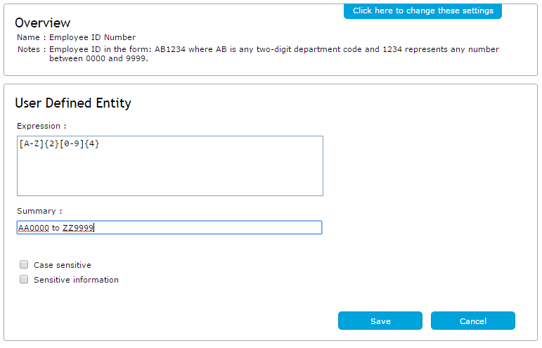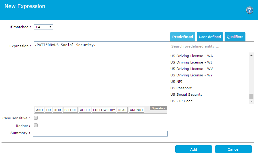 Lexical expressions are used to define sensitive words, phrases or patterns which trigger your security policy. You can build your own lexical expressions or use predefined lexical patterns.
