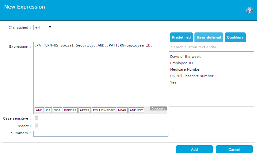 4. Enter the expression. You can build your own lexical expression by typing it into the Expression box, or you can build an expression using text entities: