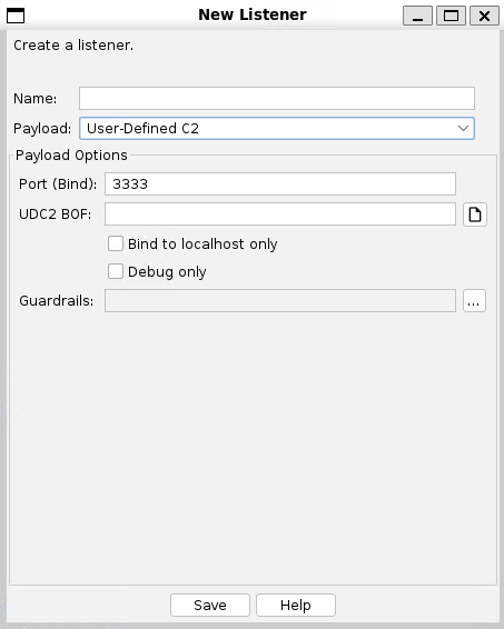 For example, if you are setting up a listener that is strictly for debugging your BOF in the UDC2-VS project, use a name such as “udc2-debug.” Using “udc2-<protocol>-<arch>” can help with identifying the listener when generating a payload. Keep in mind, the name you enter will be how you will refer to this listener through Cobalt Strike’s commands and workflows. This name will also be associated with the BOF that you provide.