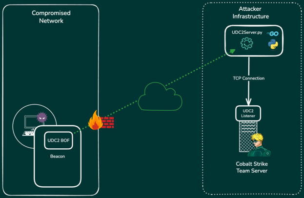 Beacon calls into the UDC2 BOF to send encrypted frames over the C2 channel you implemented in your BOF. The BOF will send and receive Beacon frame data by way of your UDC2 server using your C2 protocol. The UDC2 server acts as a relay for the frame data, forwarding it to and from the UDC2 listener on your Cobalt Strike team server by way of a direct TCP connection. There is no hard requirement that states the UDC2 server and the team server must exist on the same network segment. The UDC2 server can be located anywhere, so long as it can establish a TCP connection with the team server on the required UDC2 listener port.