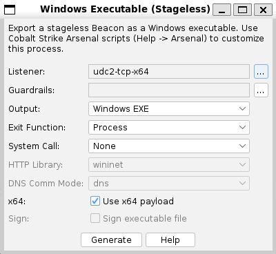 Go to Payloads in Cobalt Strike and then select your preferred payload generator. In the Listener box, select the listener you created in Creating a User-Defined C2 Listener. Now, when the payload is generated, your BOF will be patched in. Note also that UDC2 supports transformations and UDRLs. Previously, with External C2, it was not possible to apply any Beacon transformations or UDRLs to payloads. With UDC2, Sleepmask and UDRL hooks are fully supported.