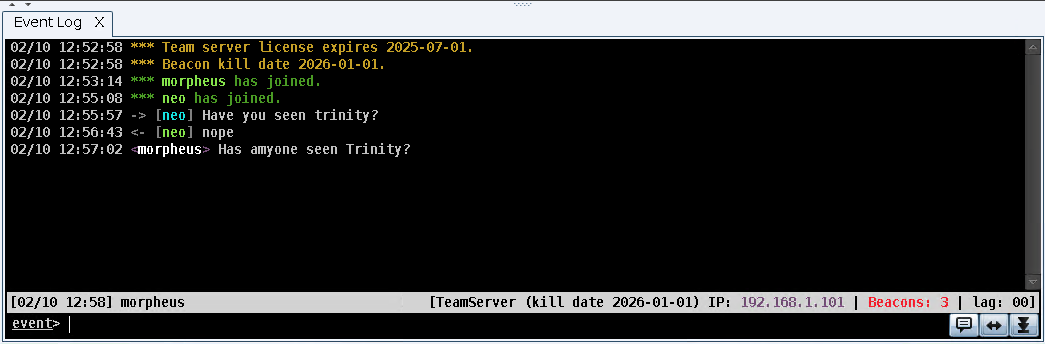 Cobalt Strike provides a console to interact with Beacon sessions, scripts, and chat with your teammates.