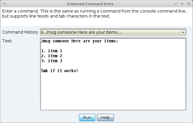 You can send public messages to all other users with the bottom event line on the dialog by entering a string, and then pressing the Run button to run the command. For example, Has anyone seen trinity?
