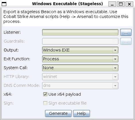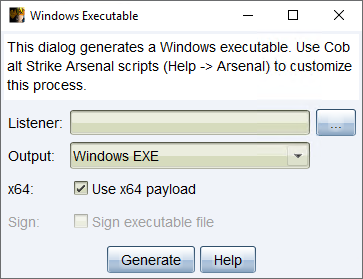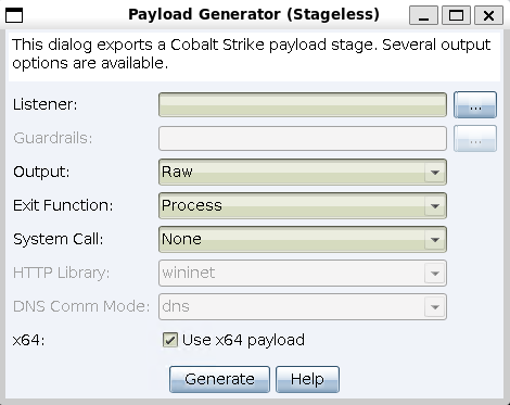 x64- Check the box to generate x64 artifacts that pair with an x64 stager. By default, this dialog exports x64 payload stagers.