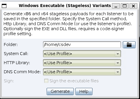 Sign - Check the box to sign an EXE or DLL artifact with a code-signing certificate. You must specify a certificate in a Malleable C2 profile. When connected to one team server the check box is enabled when the certificate is configured in the Malleable C2 profile. When connected to more than one team server the check box will be enabled, and if checked the executable file will be signed with the certificate that is configured in the listener’s profile for the payload being generated.