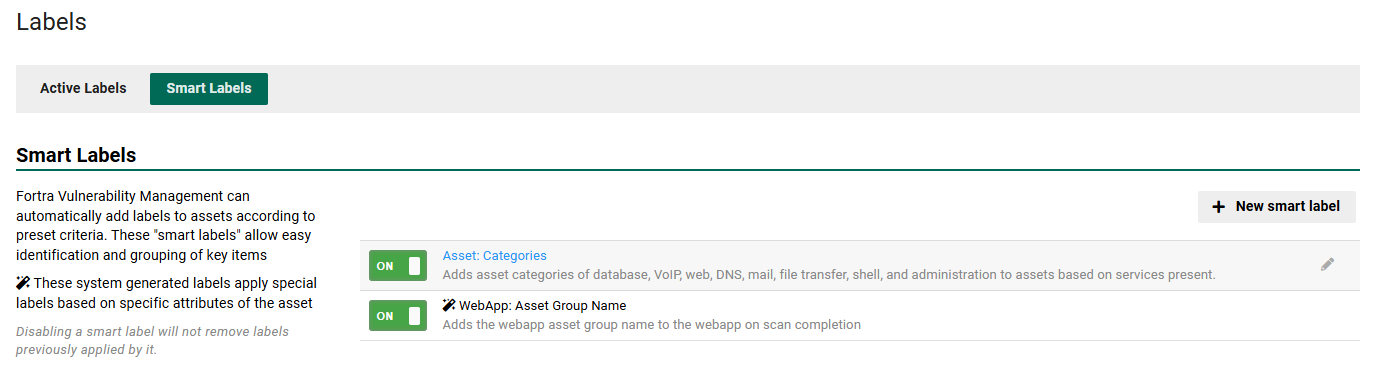 - Select the Smart Labels tab. From here, you can manage WAS pre-configured Smart Labels or create your own.