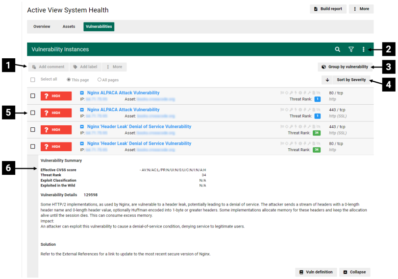 6 | The abbreviated vulnerability description and suggested solutions (appears when you select a vulnerability name).