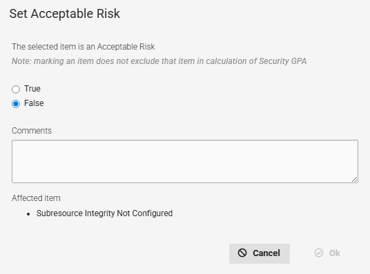 | 8 | Set Acceptable Risk Marking a vulnerability as an acceptable risk indicates that you understand the risk that the vulnerability poses, but you cannot or will not fix it. This hides the vulnerability from Active View, but the vulnerability will still factor into the Security GPA. |