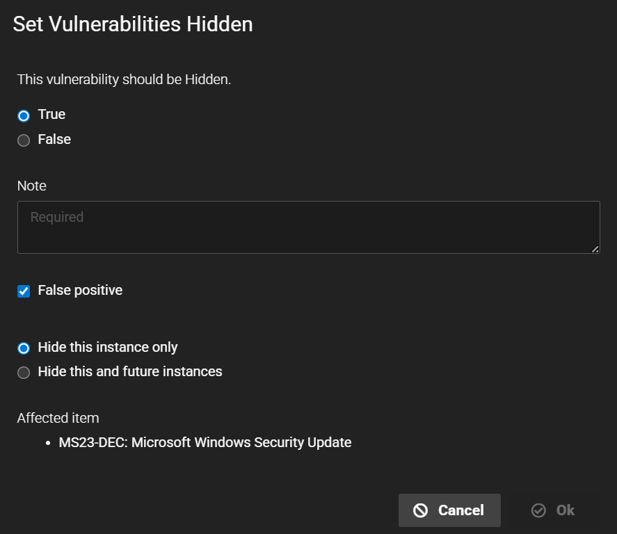 Removes an vulnerability from view without deleting its historical data. This option is ideal when you want to keep the vulnerability’s history but exclude it from visibility. Use this option to also mark a vulnerability as a false positive. When a vulnerability is hidden, its ranking will not be calculated into the Security GPA. To use this option, select one or more vulnerabilities and then select More > Set hidden. In the Set Vulnerabilities Hidden dialog, select True to see options for hiding the vulnerability. If your organization has confirmed the vulnerability is not found in your environment, select False positive to hide the vulnerability and share this information with Fortra to improve future detection logic for this vulnerability. You can choose to either Hide this instance only or Hide this and future instances. Both options will remove the vulnerability from view and from the Security GPA calculation, but if you select Hide this instance only and the vulnerability appears in a future scan, it will appear again in Active View. This may be desirable if the vulnerability is not important for your organization currently, but you want to review it again in the future. |