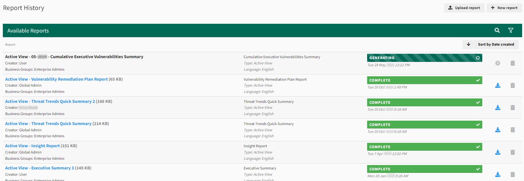 Reports are displayed with descriptions, status, view filters, view sorting, search option, and buttons to delete or download.
