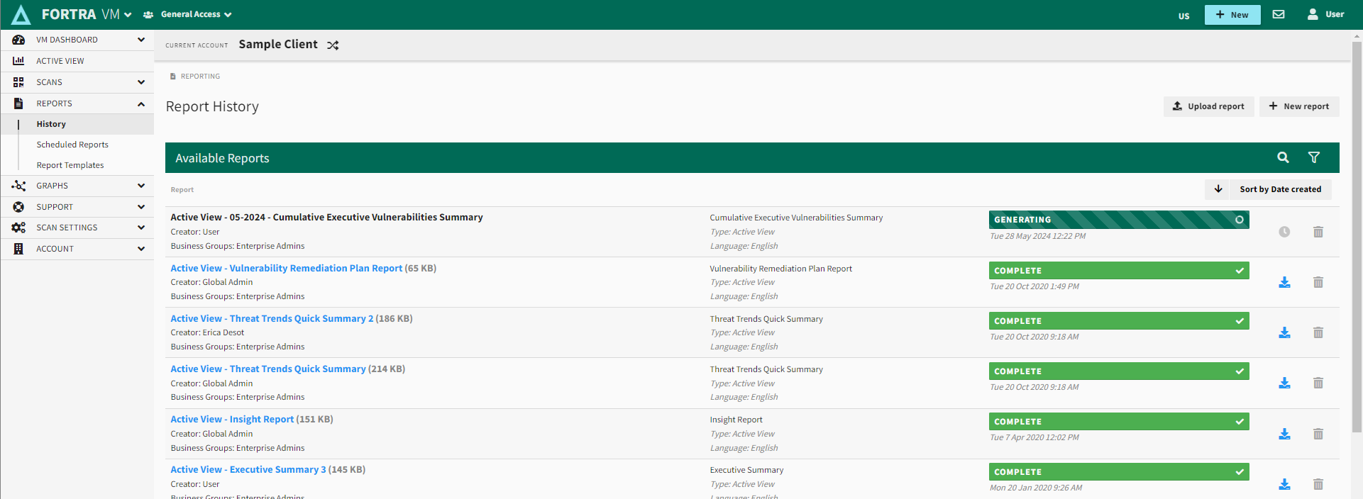 This section describes the ways you can create reports in Fortra VM. Reports allow users to sort and display information on various datasets for use in audit, compliance, export, and Fortra VM use.