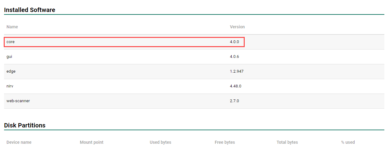 To determine which version of the RNA platform you're running, locate the core version description for the activated RNA in question. From the navigation pane, select the Scan Settings > Scanners. Select the RNA you're investigating and scroll down to locate the Installed Software section. The core item lists the RNA platform version.