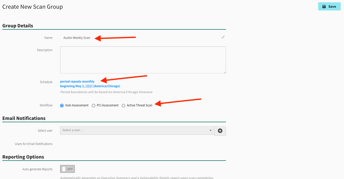 Workflow: Select either Vuln Assessment, PCI Assessment, or Active Threat Scan to designate the function of this scan group.