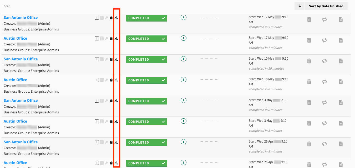 Individual scans that are part of a scan group will still appear in the scan activity page. If a scan is part of a scan group, it will be designated by the icon depicting a pyramid of dots.