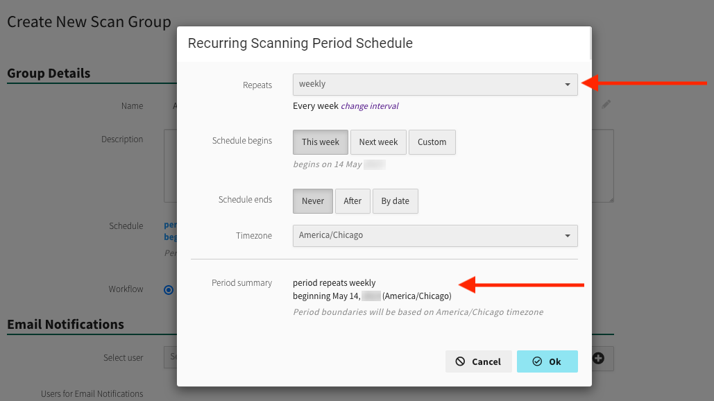 Schedule - Set the recurring scanning period and schedule when scans will begin and end. Defaults to starting on a calendar week, but can be altered to a specific date.