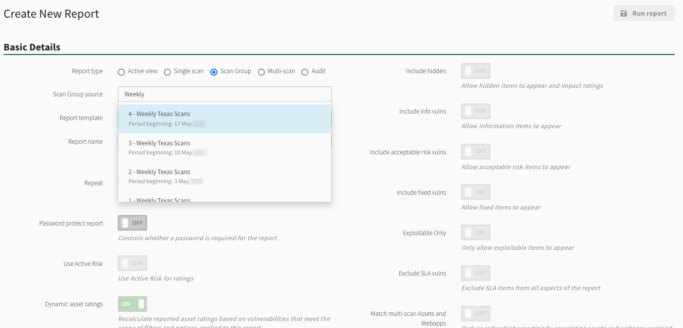 Scan Group is a Report Type option available when creating a new report. When selected, use the Scan Group source to select the specific scan group from the drop-down. All other report options remain the same. See Reports for further details.
