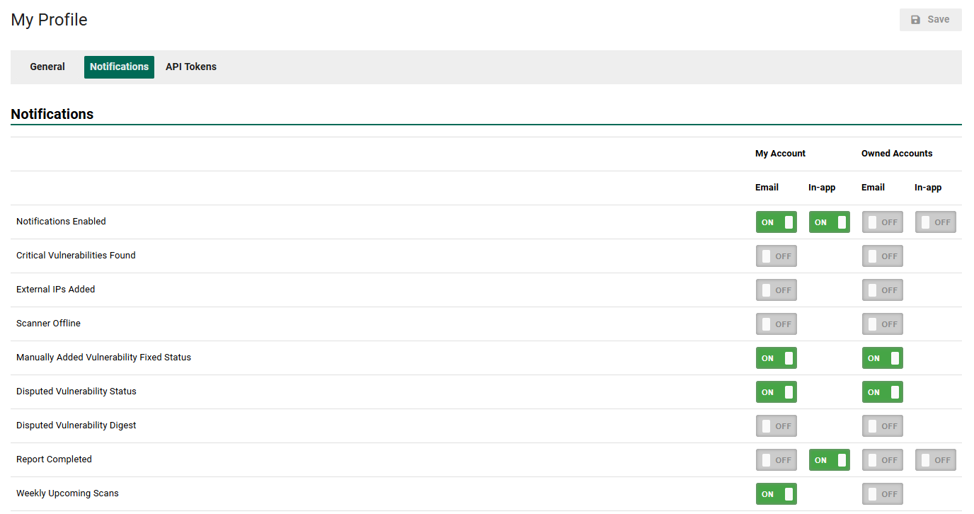 Each user can toggle notification settings ON or OFF by selecting Account > My Profile, and then selecting the Notifications tab.