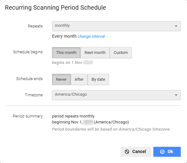 TIP: Both the schedule and period need to match. A weekly schedule cannot run monthly scans, but weekly scans can be set to run on different days of the week. -
