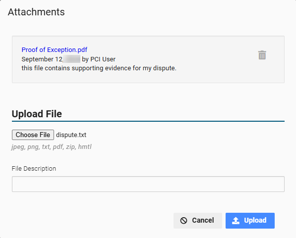 Complete the dispute request by selecting the appropriate type of dispute and use the comment field to provide an explanation of the dispute for the Fortra PCI analyst to review.