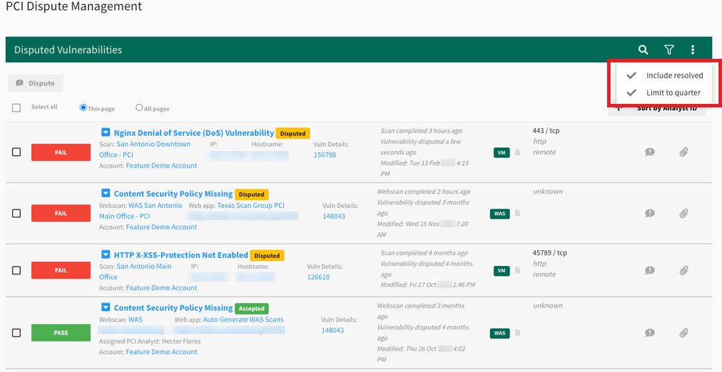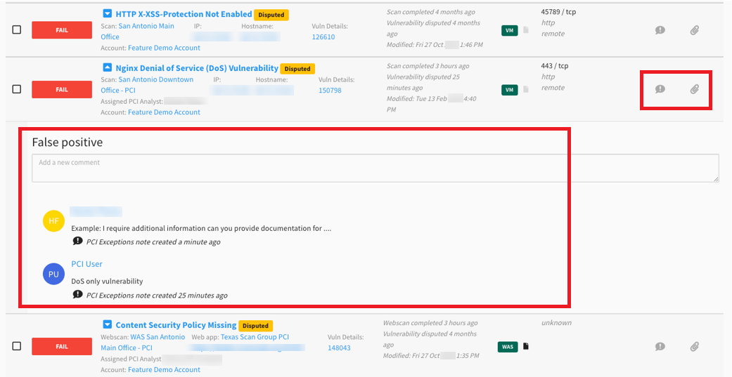As the Fortra PCI analyst conducts their review, there will be comments and questions posted to the vulnerability that may require a response or supporting files. A consolidated view is available to manage all disputed PCI vulnerabilities from both Fortra VM and WAS scans.
