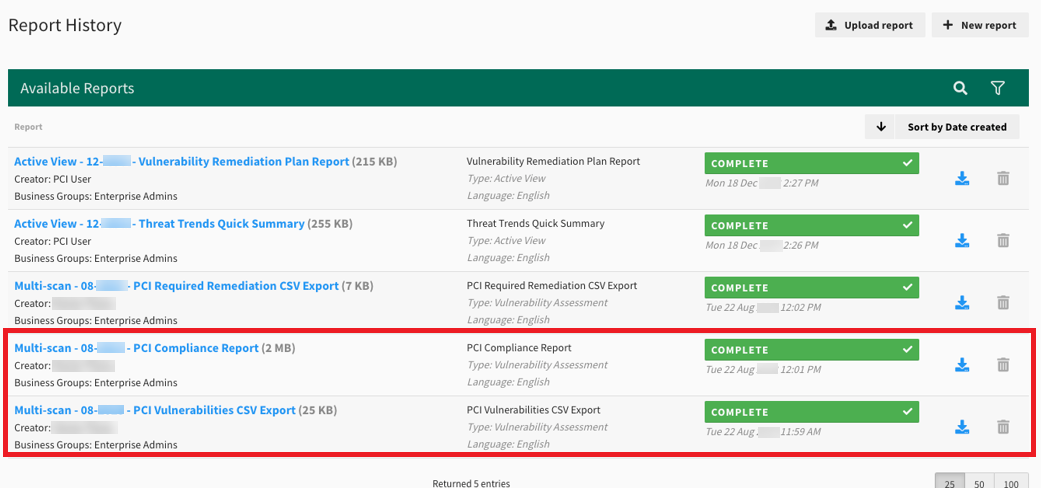 IMPORTANT: Reports that are experiencing errors, still generating, or being reviewed by Fortra PCI analysts will be listed but cannot be downloaded.
