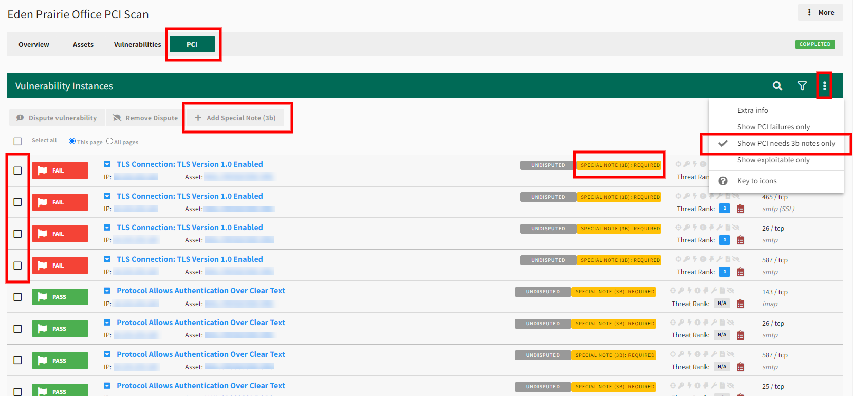 On the Scan Overview page, go to PCI Progress and select PCI Requires 3b Notes to see vulnerabilities that require documentation. You can also get to this list by going to the PCI tab, selecting the More icon and selecting Show PCI needs 3b notes only.