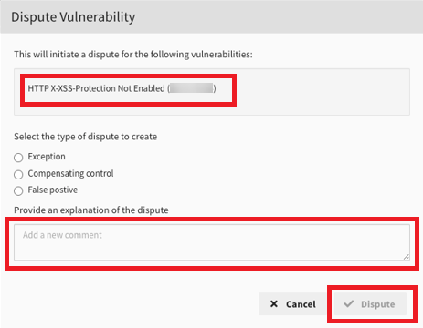 Select the checkbox for the vulnerability and select Dispute vulnerability to open the Dispute Vulnerability form.