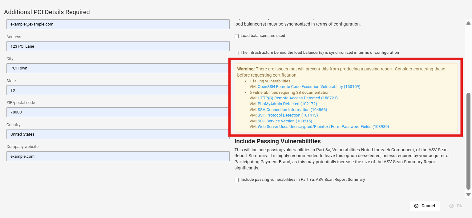 Unless otherwise specified by the scan customer, the acquirer, or Participating Payment Brand, vulnerabilities that do not impact PCI DSS compliance (for example, low severity vulnerabilities will be omitted from the ASV Scan Report Summary (Part 3a). Including all vulnerabilities may increase the size of the report significantly.