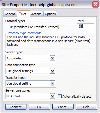 On the Type tab of the Site Properties, you can synchronize the time zone, and define the server type, data connection type, and transfer type.