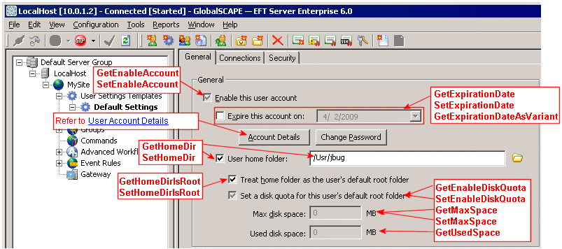 User account general settings include whether the account is enabled, get/set expiration date, get/set the home folder, and get/set user disk quota. You can view/set the user account general settings in the Administrator interface on the user's General tab. The illustration below is labeled with some of the parameters that are available in the ICIClientSettings interface for the user account's general settings.