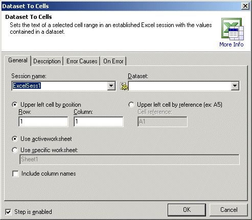 Session name: Specifies the session name to identify which document should be changed from prior Excel steps. This allows several Excel files to be open simultaneously. If working with only one document, this value should not be changed from its default value. Text, Optional - Default "Default" Dataset: Specifies the dataset holding the data that should to set to the desired cells range at runtime. Variable, Required Upper left cell by position: Row: Specifies the row of the upper left cell where the data should be set. If specified, CELLCOLUMN must also be specified. Text, Optional Default ""l Column: Specifies the column of the upper left cell where the data should be set. If specified, CELLROW must also be specified. Text, Optional Default "" Upper left cell by reference: Specifies the reference of the upper left cell where the data should be set. This is an alternate method to specifying the row and column of the desired cell. If specified, CELLROW and CELLCOLUMN are ignored. Text, Optional Default "" Use active worksheet or Use specific worksheet: Use the current active worksheet or specify the name of the new worksheet that the text will be set to. Text, Optional Default "" Include column names: When selected, outputs the dataset column names as the first row. The dataset values are then output in subsequent rows. Yes/No, Optional - Default NO |