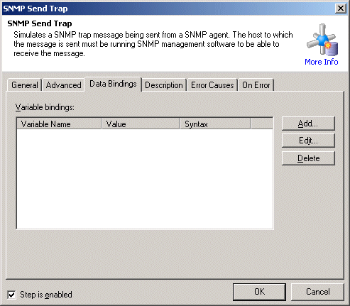 After you click OK, the variable binding is added to the list. Variable name: Specifies the name/OID for a variable to be associated with a value in order to further define the trap notification. This can be entered in either numeric or string notation format. Text, Optional Variable value: Specifies the value to assign to the variable. Text, Optional Variable syntax: Specifies the data type.