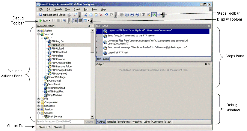 The Advanced Workflow Designer is the main interface used to define Workflows that you can use in Event Rules. The Designer is used to build and test Workflow-specific actions or steps that should be carried out when the Workflow is run (or triggered automatically); use Events to trigger the Workflow, for example, in a Scheduler (Timer) Event Rule. The name of the Workflow appears in the Title Bar and the Steps pane. When more than one Workflow is open in Designer, you select the Workflow to view by clicking its tab at the bottom of the Steps pane. When a Workflow is selected, the Status bar and Debug Window show data for that Workflow.
