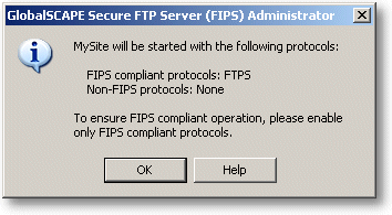 The Federal Information Processing Standard (FIPS) Publication 140-2 specifies the security requirements of cryptographic modules used to protect sensitive information. Secure FTP Server (FIPS) supports operation with the FIPS 140-2 Validated GlobalSCAPE Cryptographic Module (GSCM) for SSL/TLS and certificate generation. Imported certificates that were signed using non-FIPS compliant algorithms will be invalid.