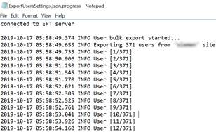 Open a text file and create a JSON file to specify the name of the site from which users will be exported. All users from all sites will be exported if the EFTSiteName value (below) is empty.