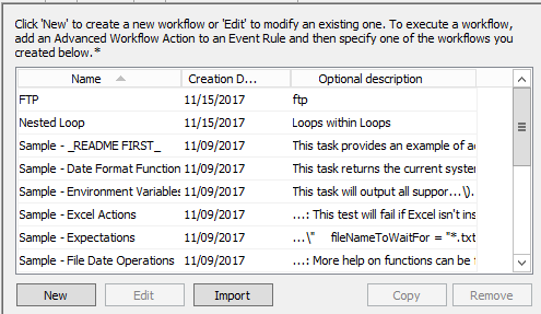 When you click the Advanced Workflows node in the Server tree, the right pane displays a list of defined workflows sorted in alphabetical order. If no workflows are defined, you can right-click the Advanced Workflows node to create a new workflow. You can edit or remove workflows in the right pane.