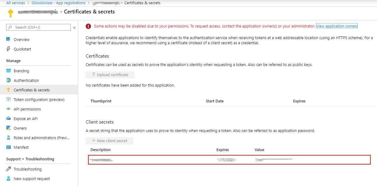 Under Client secrets, click the icon to Copy to clipboard. (You must have permission/ be the application owner to do this.)
