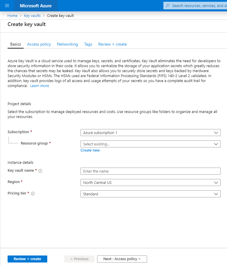 This topic provide a *general* guideline to point you in the right direction to gather the necessary information to Configure the Secrets Module in EFT, which requires the Key Vault URL, Client ID, and Client Secret used to access the Azure Key Vault. This procedure assumes you already have an Azure account. (After you click Create on the Key Vault page (in the procedure below), you can sign in if you have an account, or you can create an account.)