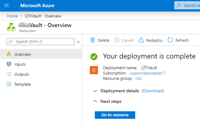 After Your deployment is complete appears, click Go to resource. You Key Vault information is displayed. (Take a screen shot and save it in a secure location.)