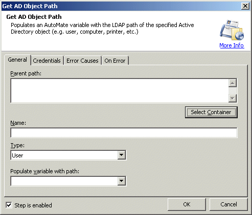 "User" Populate variable with path: Variable is populated with the first object's LDAP path found in Active Directory matching the name. Text [variable name], Required |