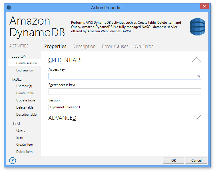 Many actions now support sessions that contain pre-configured credentials and properties that are shared amongst associated activities within a given session. Linking a combination of related activities to a single session eliminates redundancy. Additionally, a task supports construction and simultaneous execution of multiple sessions, improving efficiency.