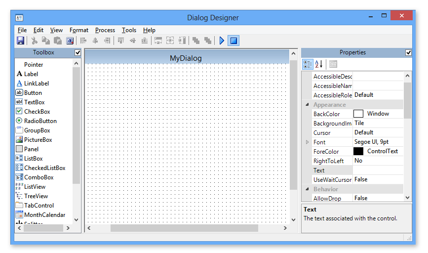 The Dialog action supports predefined dialog boxes that can convey specific information or request user input during task execution. However, a custom dialog box may be required that, for example, presents the user with specific options and then runs the appropriate steps based on the option they chose. In such cases, developers can use the new Custom dialog activity to design a custom dialog to fit their needs. A variety of controls are supported, each containing properties that can be viewed or modified via the Dialog Designer (displayed below), an intuitive graphical interface used to easily design custom dialogs.