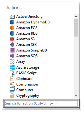 The Task Builder's Actions panel now comprises a comprehensive library of more than 600 pre-built actions/activities, eliminates the need for writing scripts and batch files altogether. The bottom portion of the Actions panel contains an intuitive search dialog that enables you to define search criteria and provide more efficient and effective searches. It supports dynamic search filtering, allowing you to enter all or part of an action's name and view only actions that contain matching text. The list is updated as you type each letter.