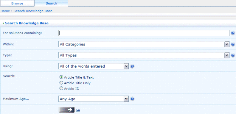 In the Search area, the options apply to where it searches, not the display of results. That is, if you search for cuteftp and then click Article ID, no results are returned, since Article IDs are numbers. For example, if you wanted to search for an article ID 10070, in the For solutions containing box type 10070, click Article ID, then click Go.