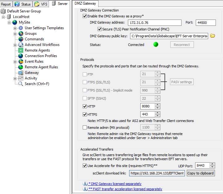 In the EFT administration interface, click the Server tab, then click the Gateway node.